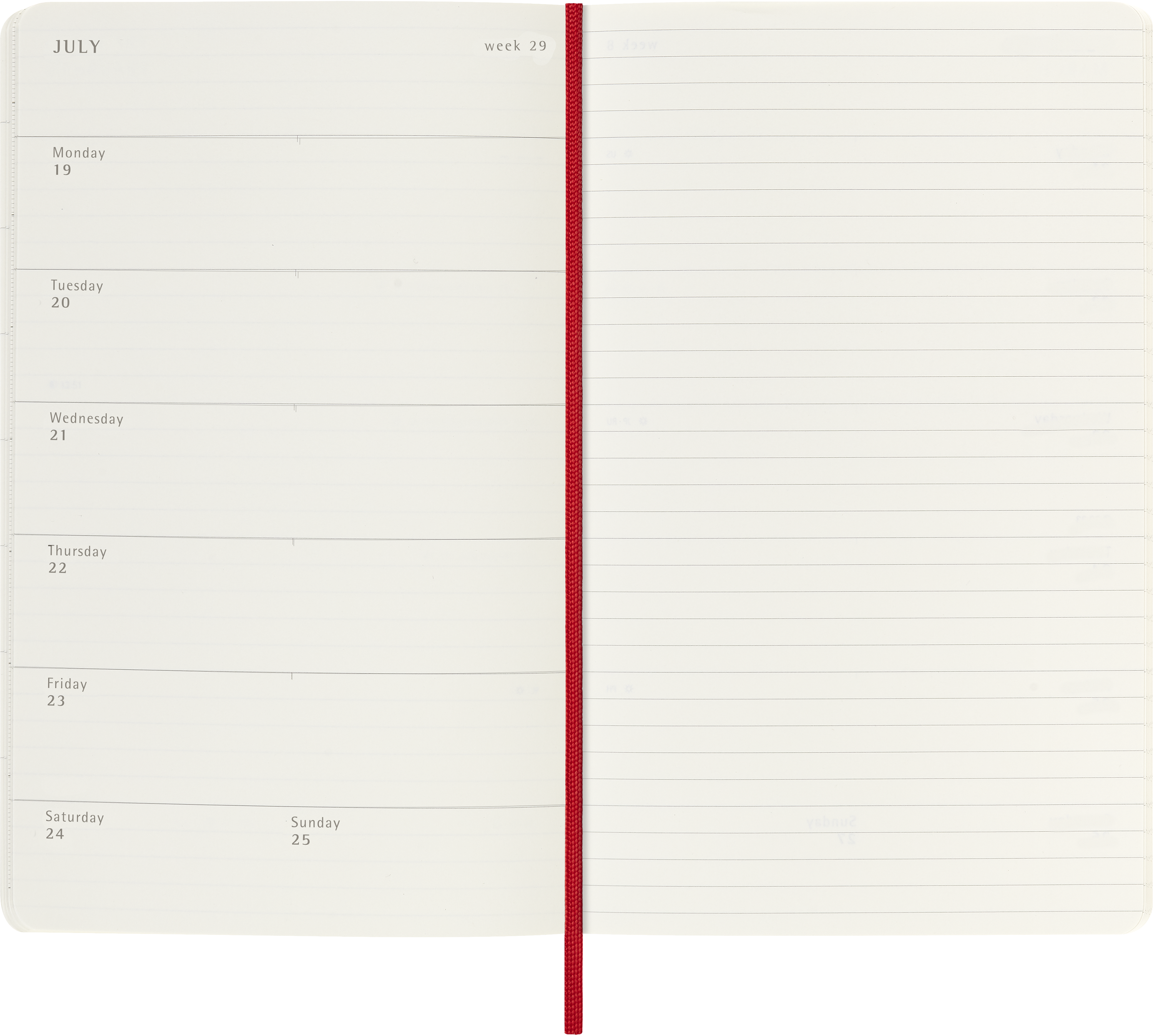 - Układ stron: tydzień na jednej stronie, druga na notatki