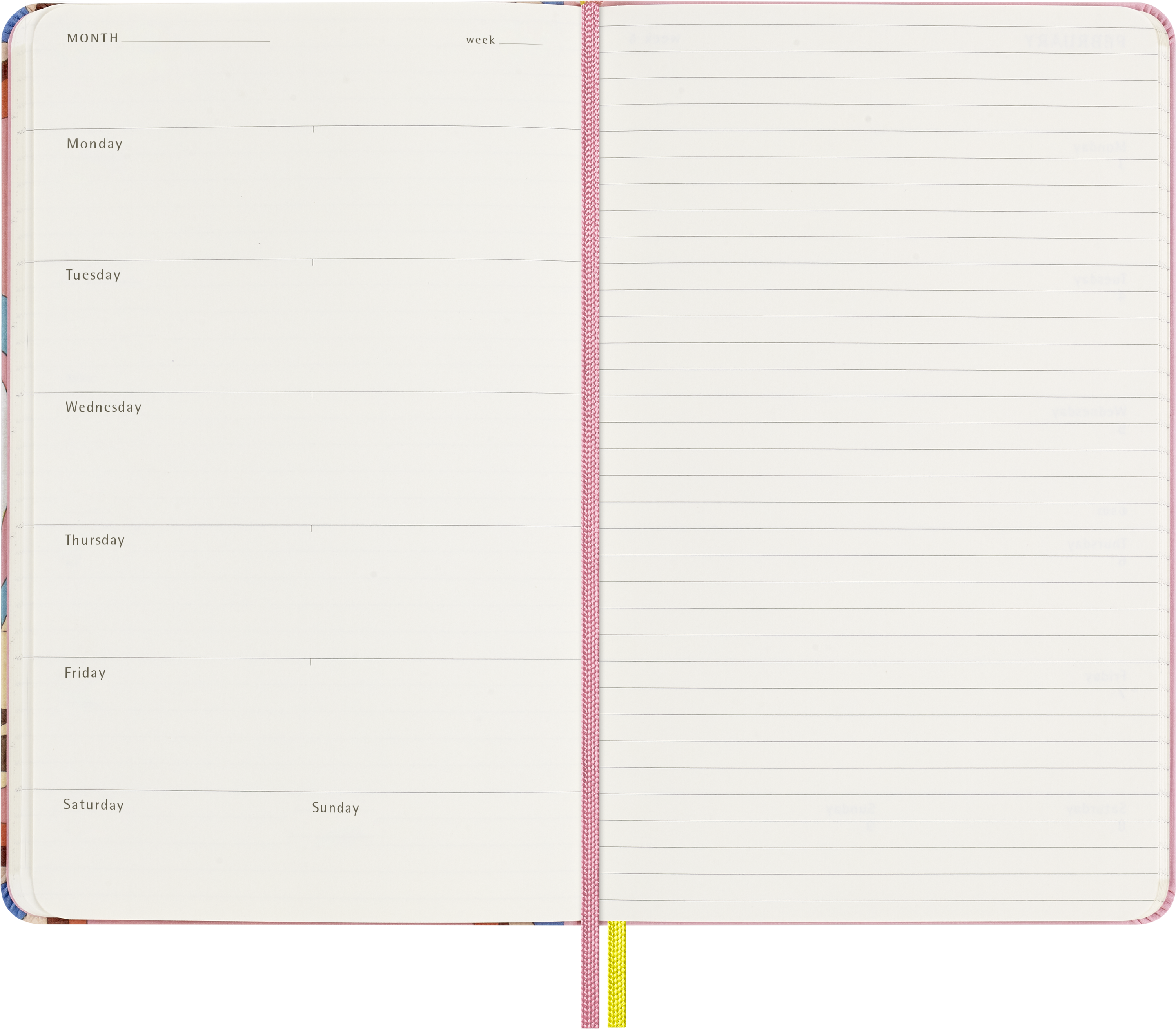 - Układ stron: Niedatowany układ tygodniowego kalendarza tydzień na 1 stronie, druga strona na notatki, 5 niedatowanych tygodni w miesiącu