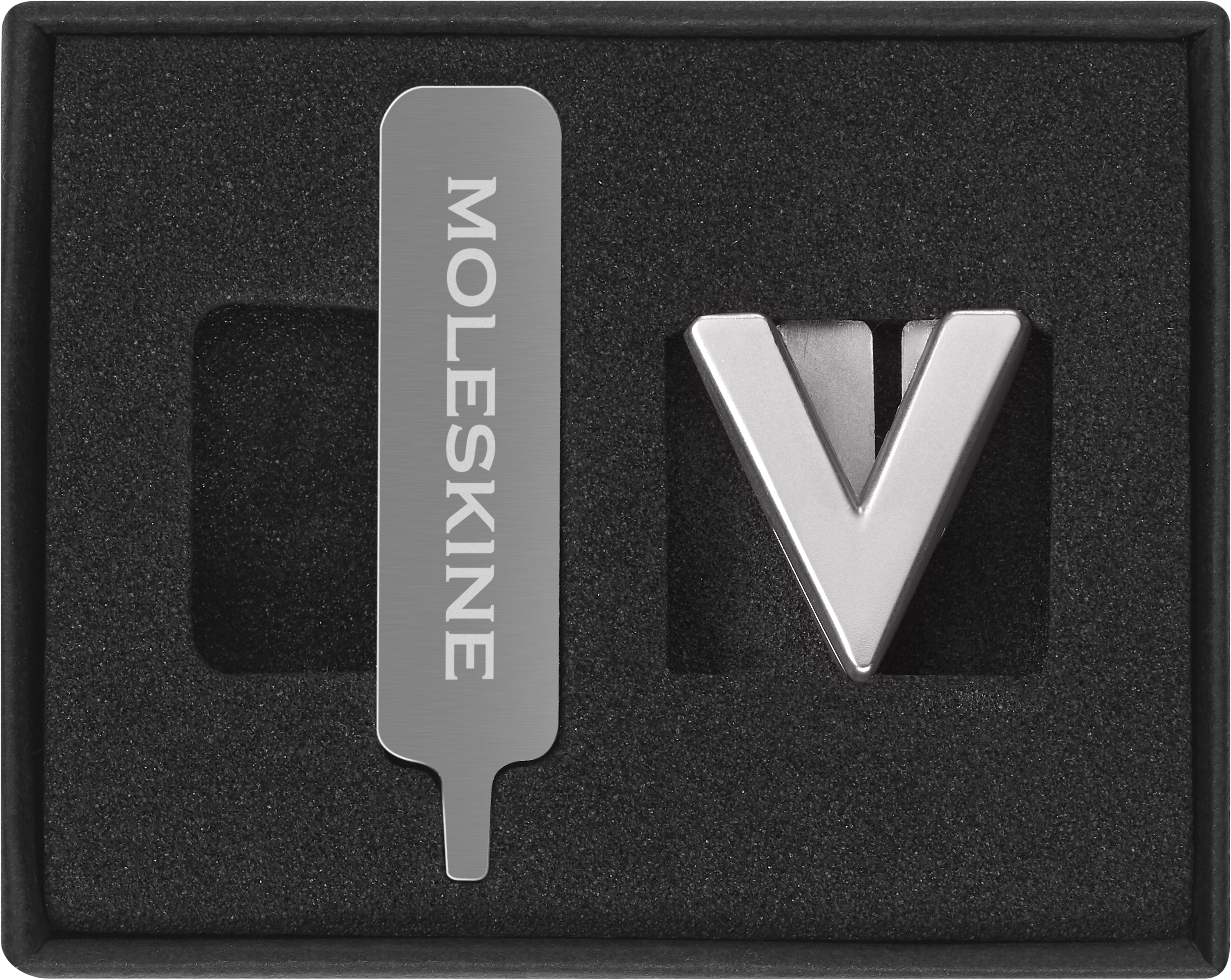 Srebrna przypinka Moleskine do notatnika kalendarza litera V