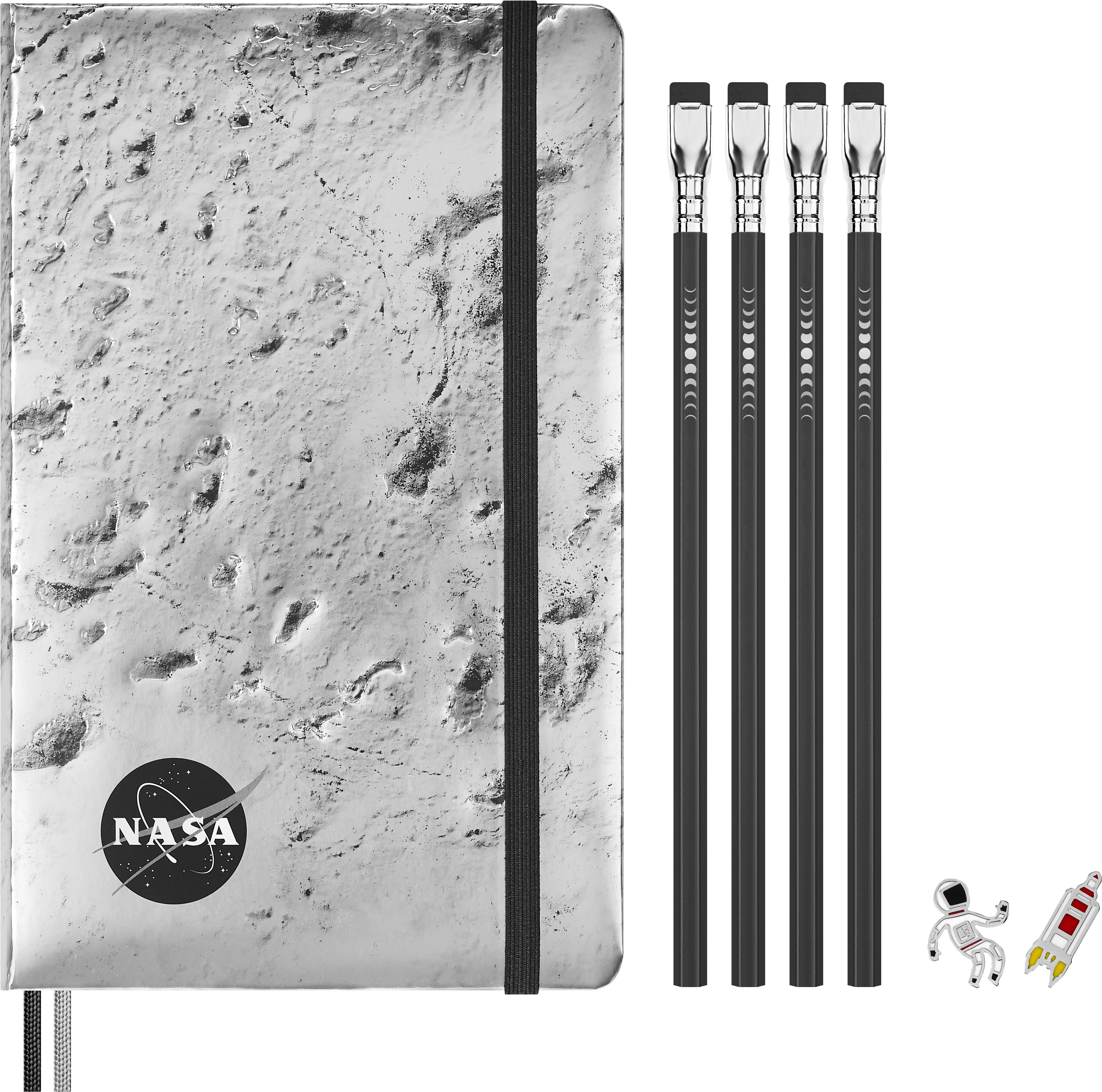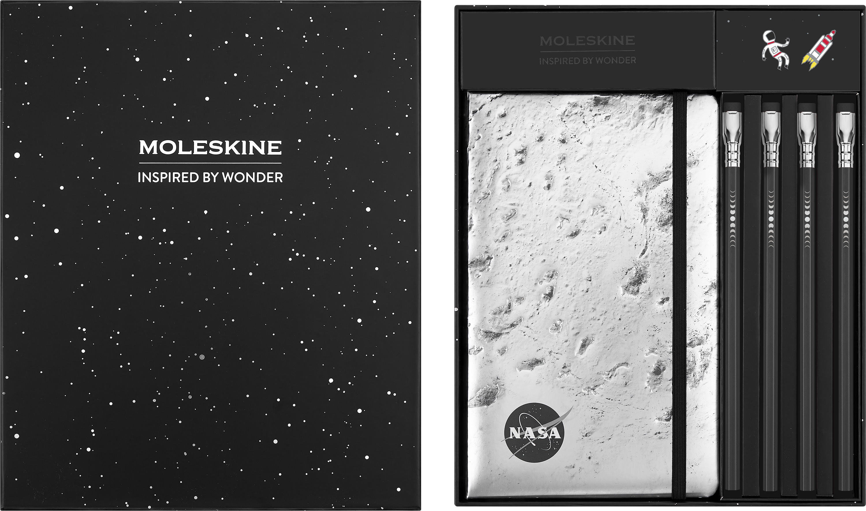 Ten wyjątkowy zestaw łączy w sobie notatnik inspirowany NASA z czterema ołówkami Moleskine x Blackwing wykonanymi z naturalnego drewna cedrowego oraz dwiema limitowanymi przypinkami NASA, które możesz umieścić na elastycznym zamknięciu notesu.