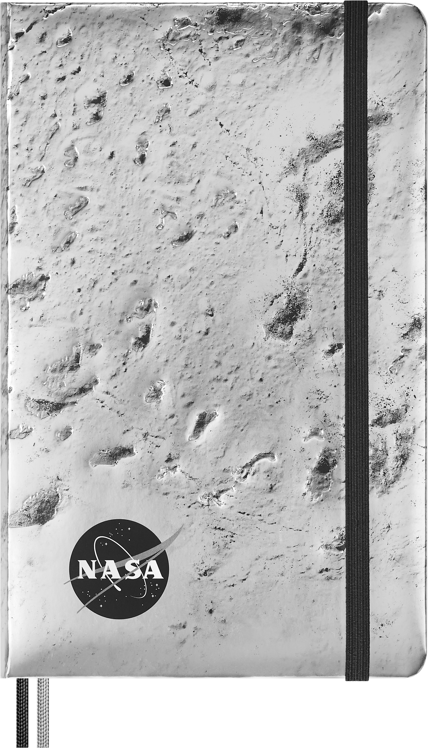 - Duży notatnik w twardej, srebrnej oprawie inspirowanej materiałami technicznymi używanymi w kosmosie